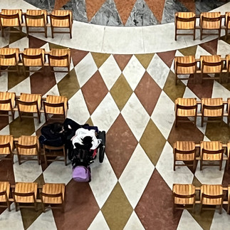 Off we went to Rabat to look for the catacombs, which were advertised as partially accessible. This was one of the very wet days, so the first thing to do on arriving in the town was to find somewhere accessible and dry to feed Racheal and get ourselves something to eat. All the cafés we looked at had steps, so we ended up in a museum foyer sheltering from the rain. Summer gave Racheal her lunch while I went out to scout the area and find a café we could get into.